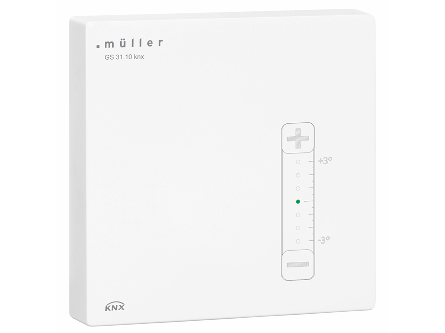 - Zusätzlich bei GS 31.10 knx / GS 31.11 knx: Solltemperatur manuell veränderbar per Touch-Bedienfeld (Einstellbereich ±3 °; Schrittweite 0,5 °)